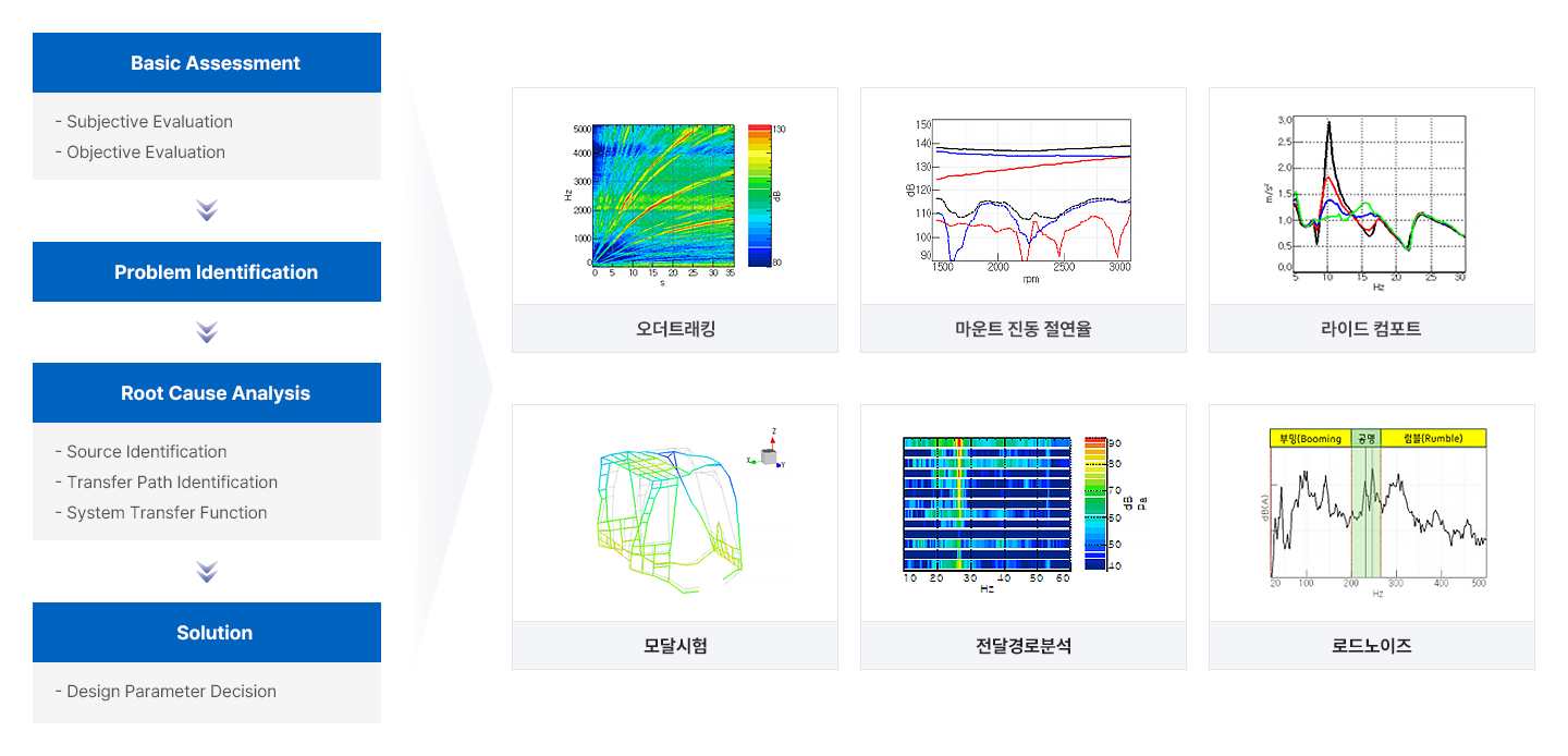 다양한 NVH 시험평가 및 분석기술을 보유하고 있으며 고객사 차량의 개발단계 및 양산차량의 진동소음 문제발생시 개선 솔루션 제공