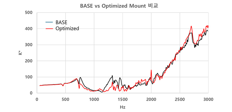 • 모터 및 감속기등의 고속회전에 의해 발생하는 특정 주파수 대역의 진동전달 최소화를 위해 주파수대역별 마운트 동강성 제어를 통한 실내소음 개선